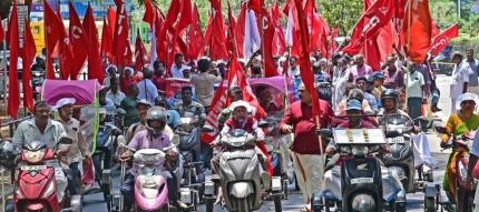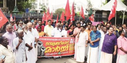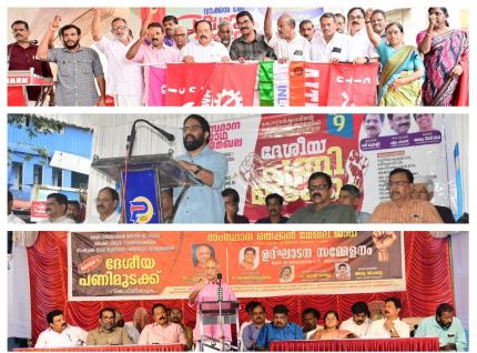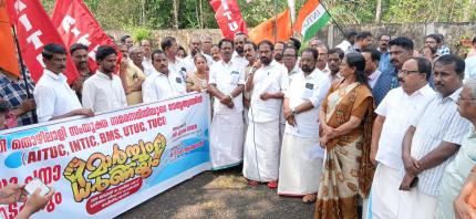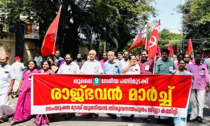 09.07.2025 - THE NATIONWIDE STRIKE OF 9TH JULY ORGANIZED BY CENTRAL TRADE UNIONS IN RESPONSE TO ANTI-WORKER AND ANTI-FARMER POLICIES WAS A GRAND SUCCESS IN KERALA. THE STRIKE EFFECTIVELY PARALYZED THE STATE, RESEMBLING A COMPLETE HARTAL. IN THE STATE CAPITAL, THIRUVANANTHAPURAM, A SIGNIFICANT MASS RALLY AND MARCH TO THE RAJ BHAVAN TOOK PLACE, DRAWING AROUND 10,000 PARTICIPANTS, INCLUDING WORKERS, EMPLOYEES, AND TEACHERS
