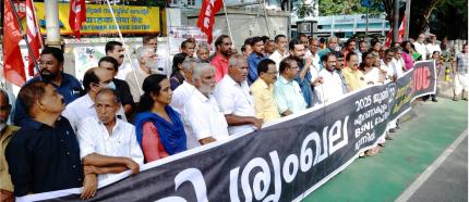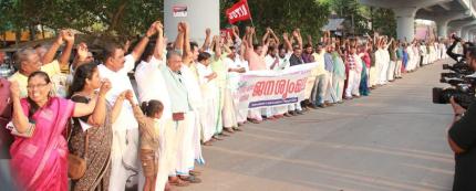 (IMAGE: HUMAN CHAIN ORGANIZED BY FISHERMEN WORKERS FEDERATION AT ALAPPUZHA BEACH IN CONNECTION WITH COASTAL HARTAL)