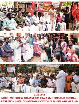 27.09.2024 - Agricultural workers organized march and dharna demanding allotment of Rs. 500 crores for the payment of pension arrears, increase in pension amount, and the protection of the welfare fund scheme. The protest took place in front of the Farm Workers Welfare Fund Board offices in various districts.